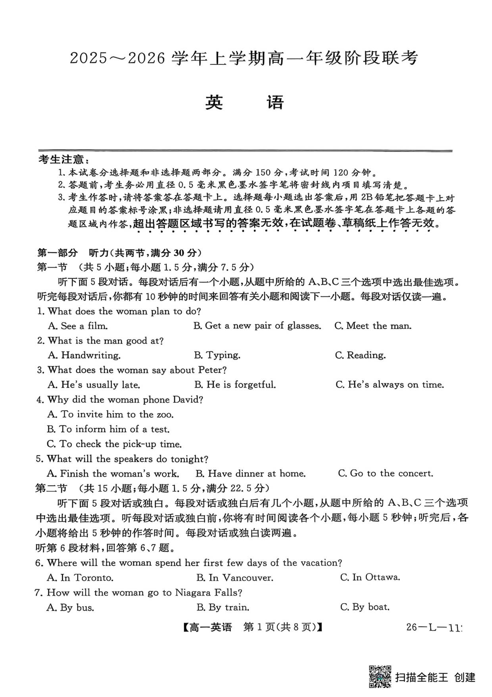 高一英语--安徽省江淮名校2025-2026学年高一上学期阶段联考