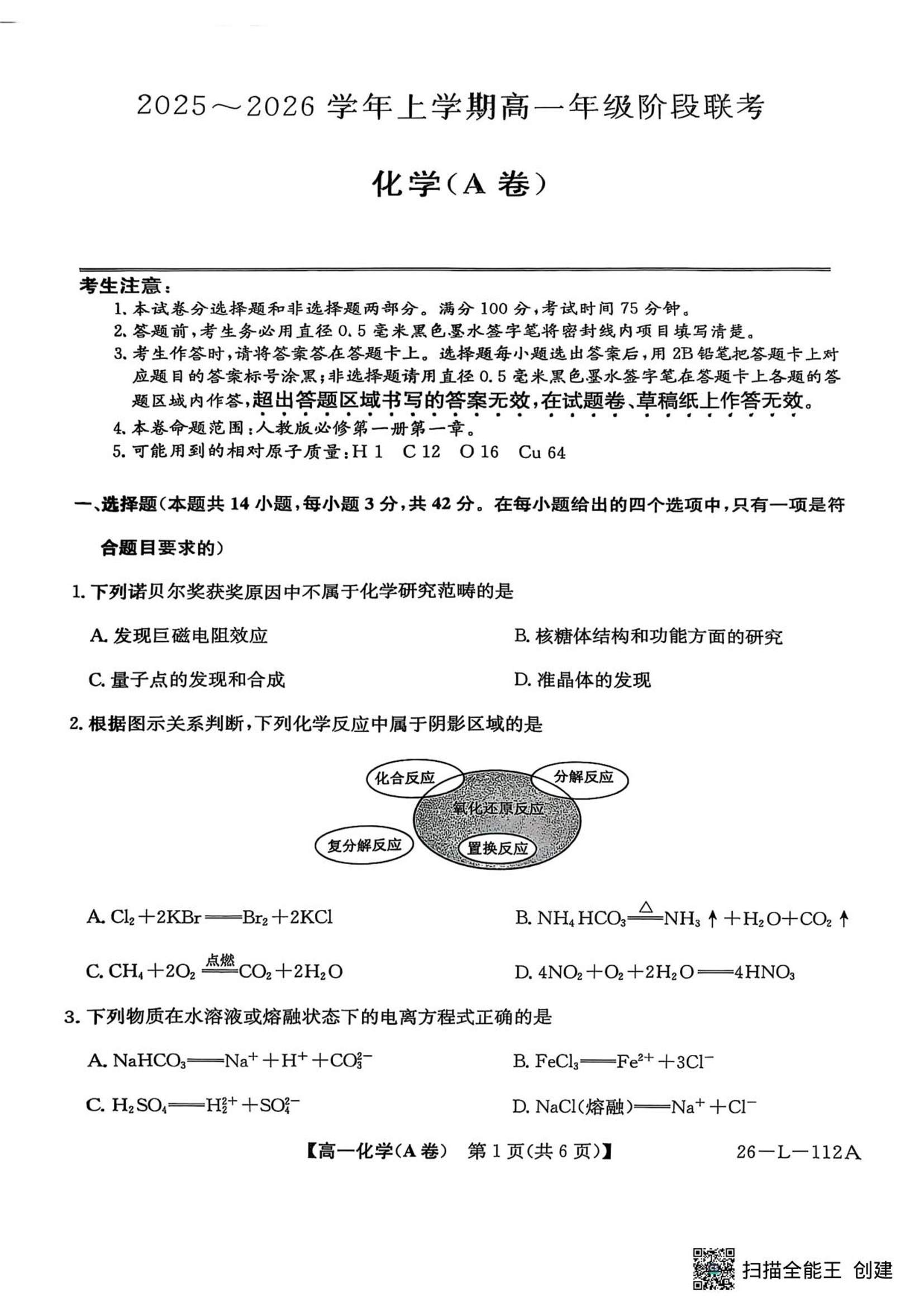 高一化学--安徽省江淮名校2025-2026学年高一上学期阶段联考