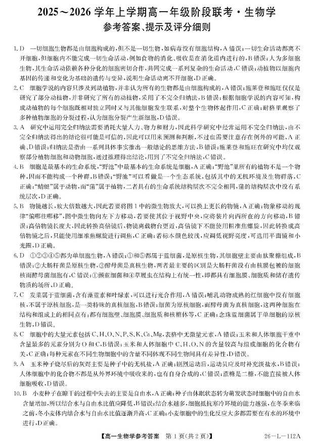 高一生物答案--安徽省江淮名校2025-2026学年高一上学期阶段联考