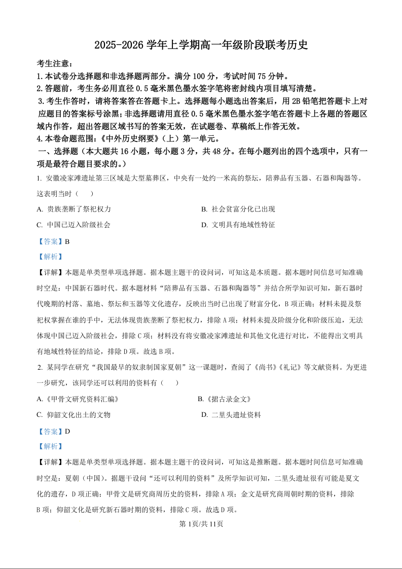 高一历史(精品解析版)--安徽省江淮名校2025-2026学年高一上学期阶段联考