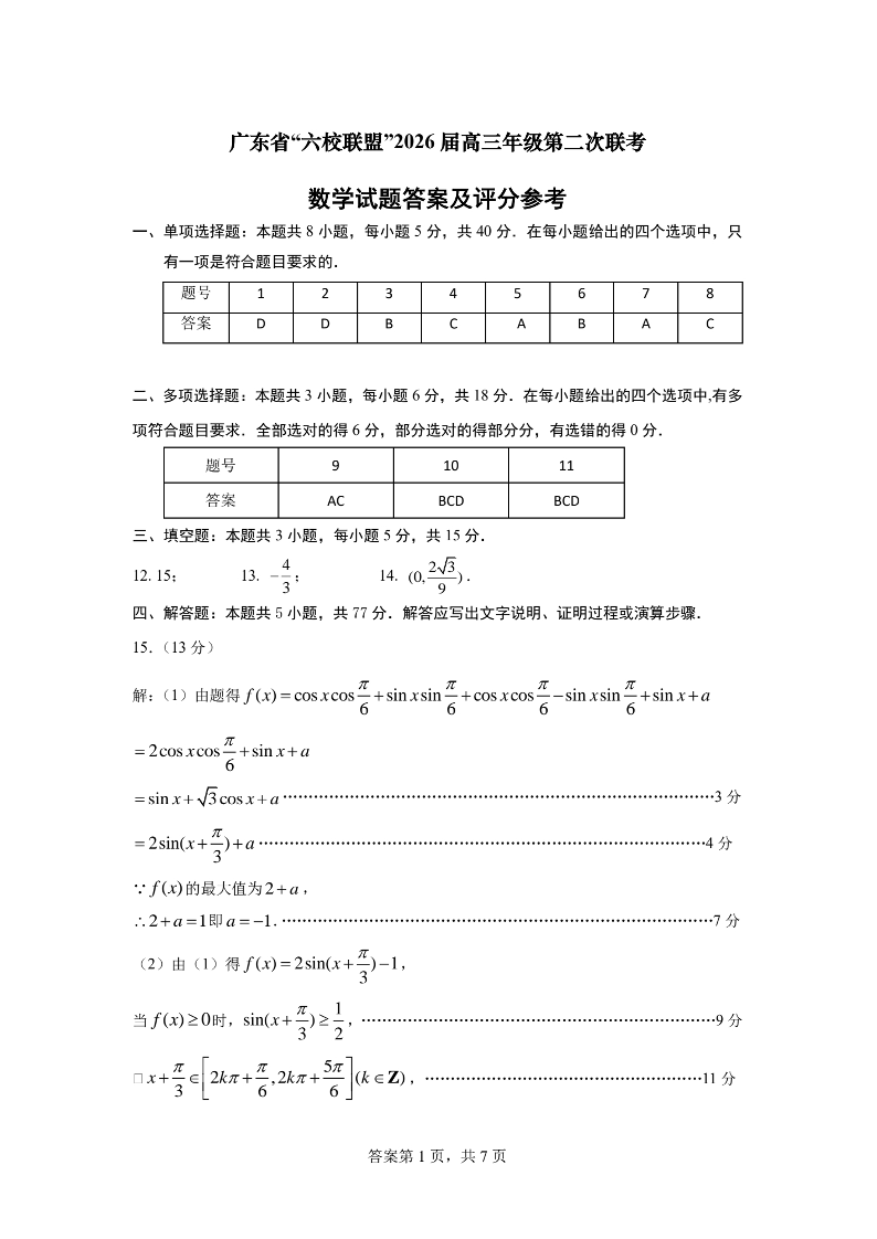 高三数学答案--广东省六校联盟2026届高三上学期第二次联考