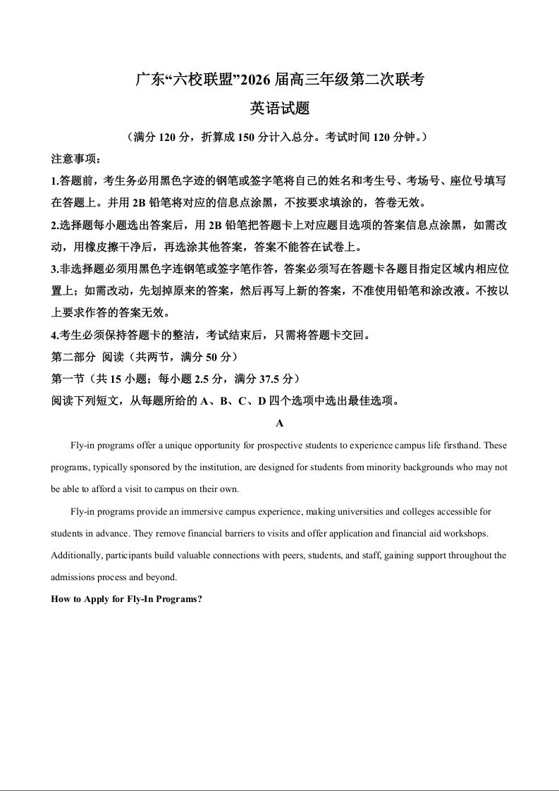 高三英语+答案--广东省六校联盟2026届高三上学期第二次联考
