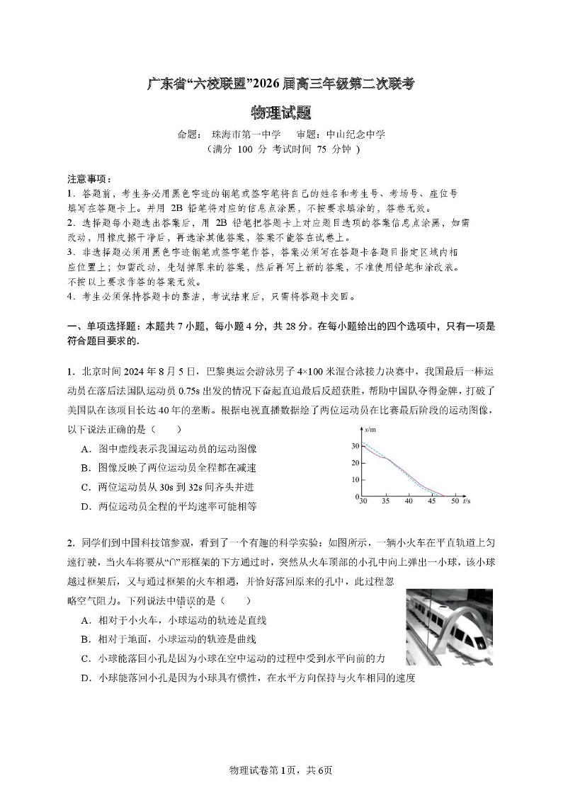 高三物理--广东省六校联盟2026届高三上学期第二次联考