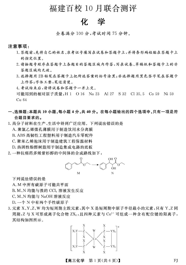 高三化学+答案--福建省2026届高三上学期10月百校联合测评