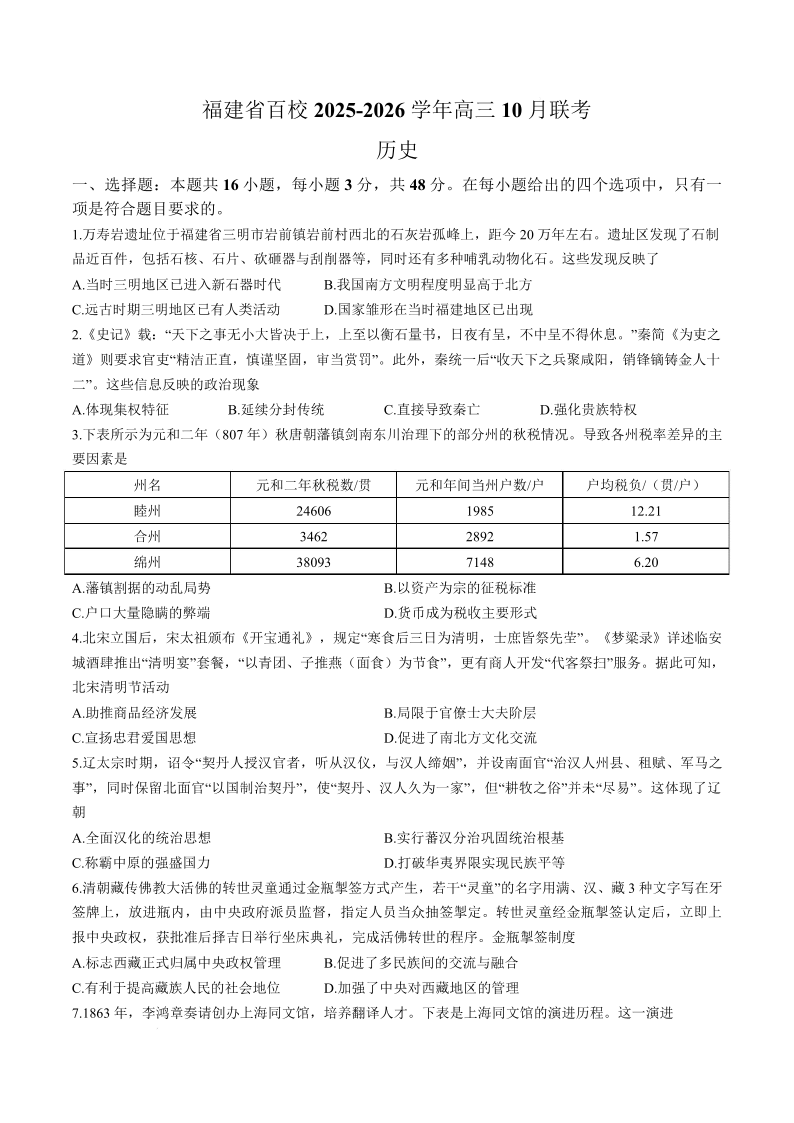 高三历史--福建省2026届高三上学期10月百校联合测评