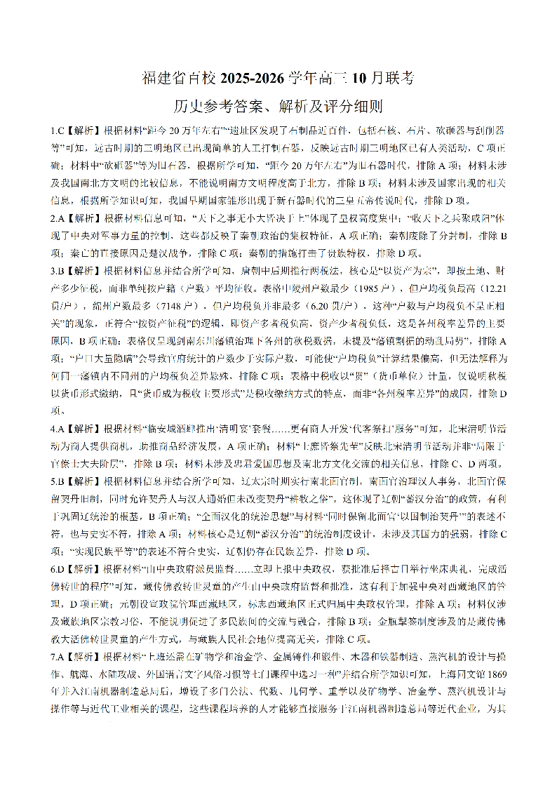 高三历史答案--福建省2026届高三上学期10月百校联合测评