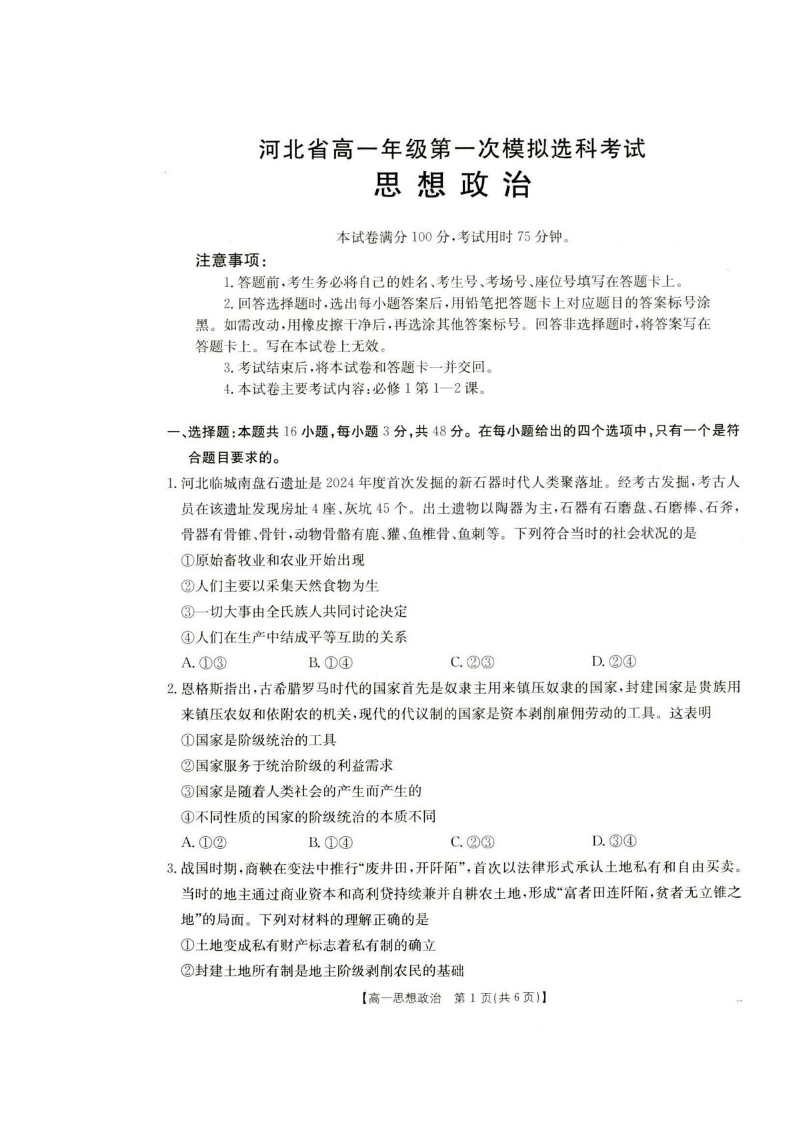 高一政治--河北省保定市部分高中2025-2026学年高一上学期10月月考