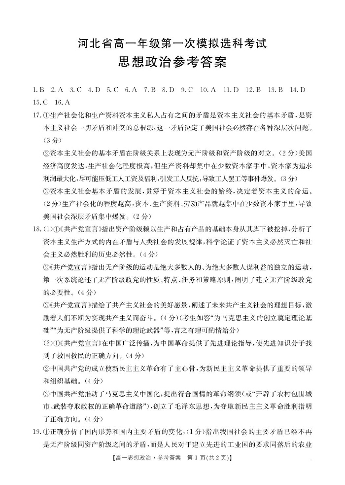 高一政治答案--河北省保定市部分高中2025-2026学年高一上学期10月月考