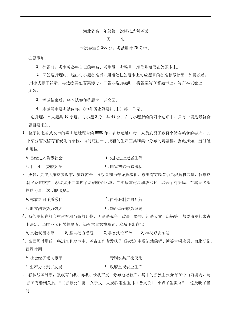 高一历史+答案--河北省保定市部分高中2025-2026学年高一上学期10月月考