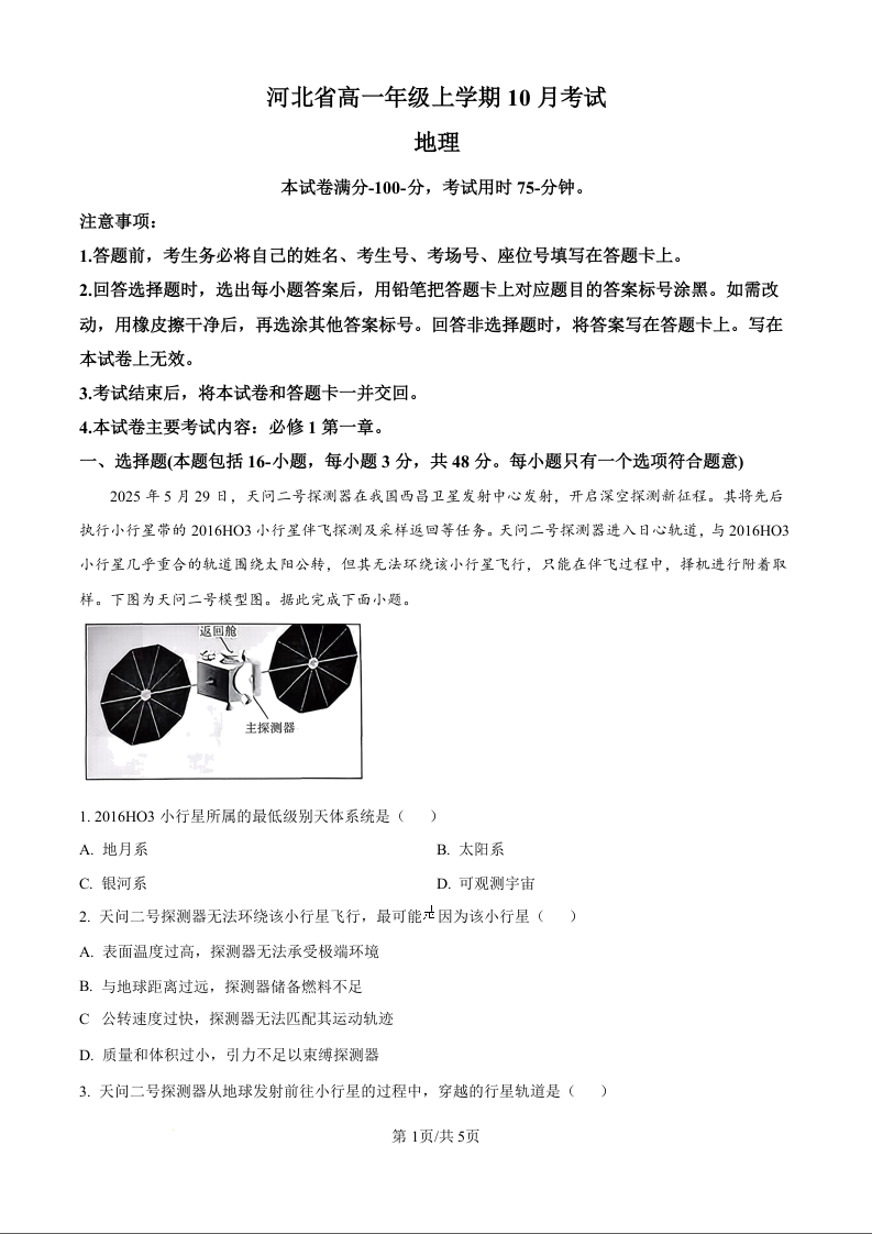 高一地理(原卷版)--河北省保定市部分高中2025-2026学年高一上学期10月月考