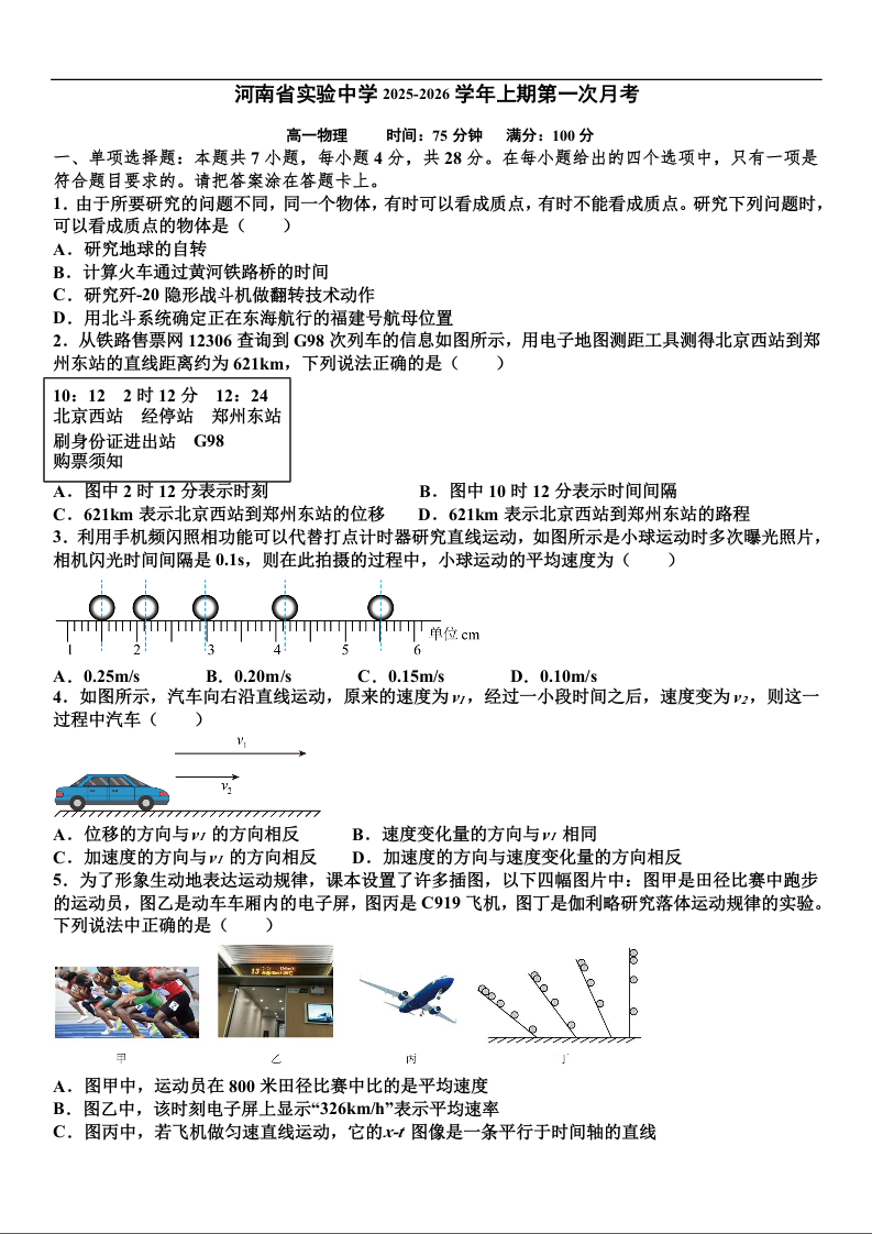 高一物理--河南省实验中学2025-2026学年高一上学期第一次月考