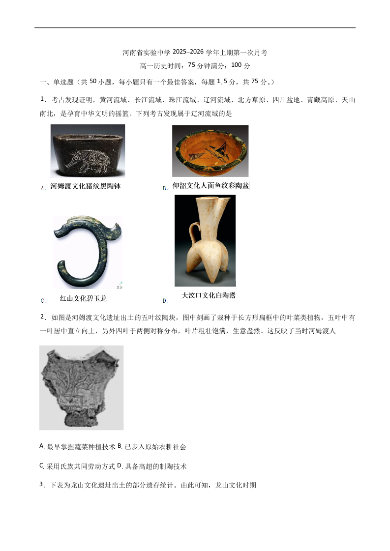 高一历史+答案--河南省实验中学2025-2026学年高一上学期第一次月考