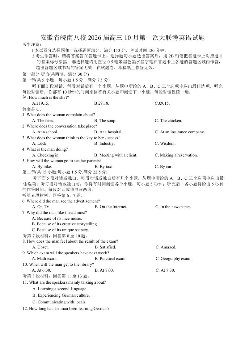 高三英语+答案--安徽省皖南八校2026届高三上学期第一次大联考