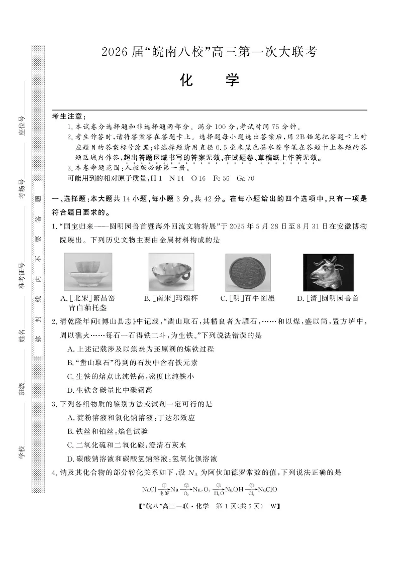 高三化学+答案--安徽省皖南八校2026届高三上学期第一次大联考