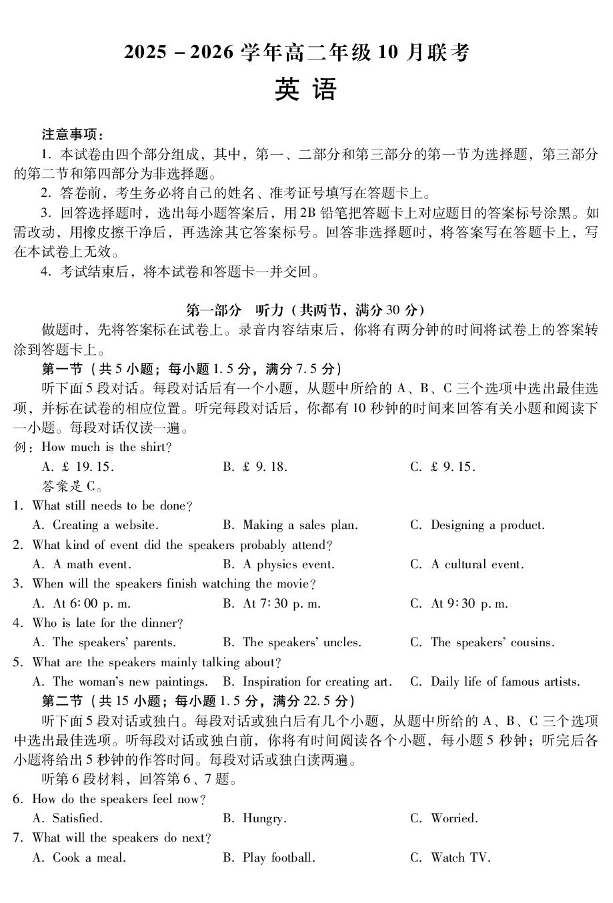 高二英语--河北省保定市部分示范高中2025-2026学年高二上学期10月月考