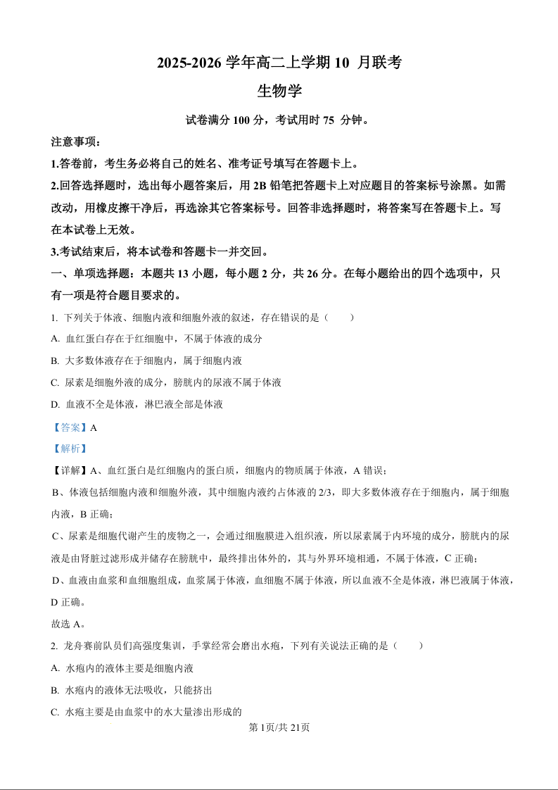 高二生物(精品解析版)--河北省保定市部分示范高中2025-2026学年高二上学期10月月考