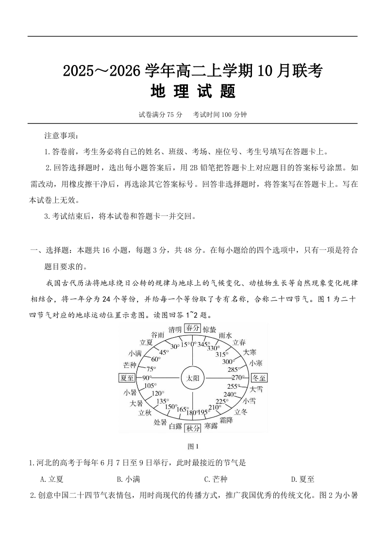 高二地理+答案--河北省保定市部分示范高中2025-2026学年高二上学期10月月考