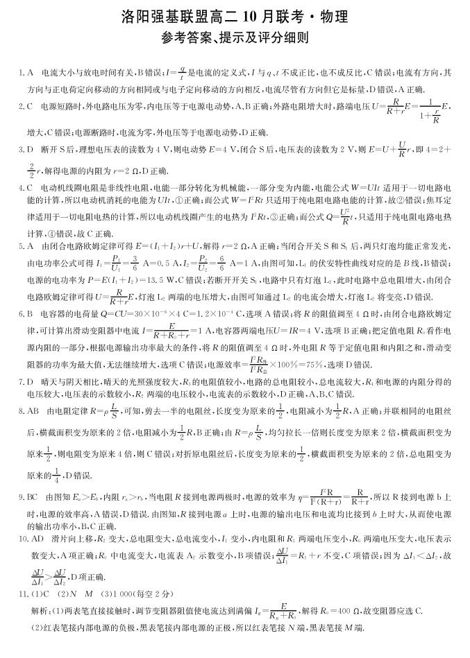 高二物理答案--河南洛阳强基联盟2025-2026学年高二上学期10月联考