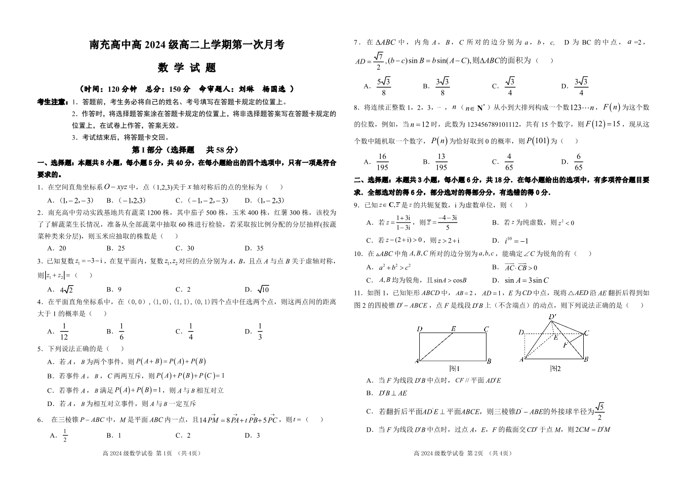 高二数学--四川省南充高级中学2025-2026学年高二上学期10月月考