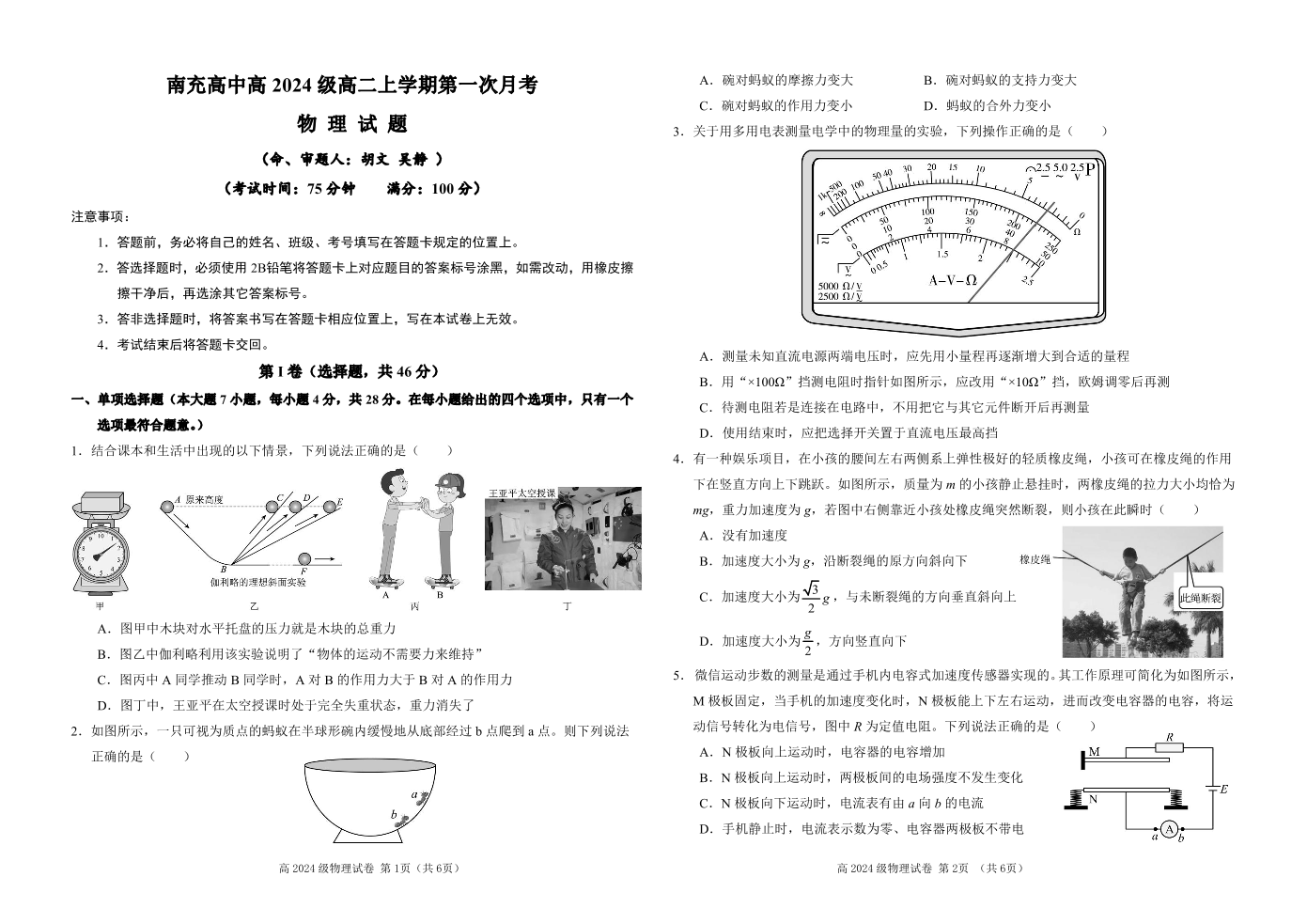 高二物理--四川省南充高级中学2025-2026学年高二上学期10月月考
