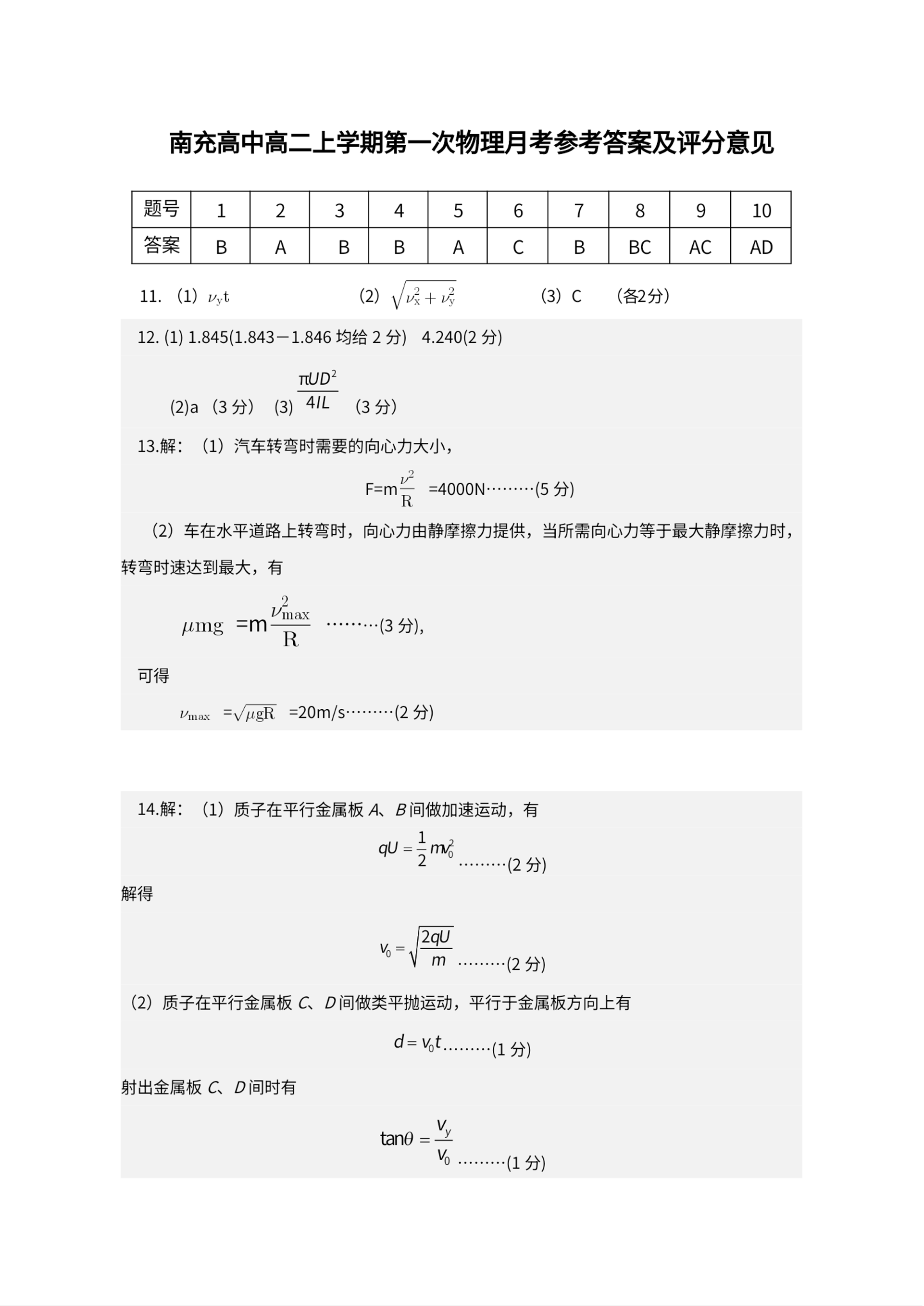 高二物理答案--四川省南充高级中学2025-2026学年高二上学期10月月考