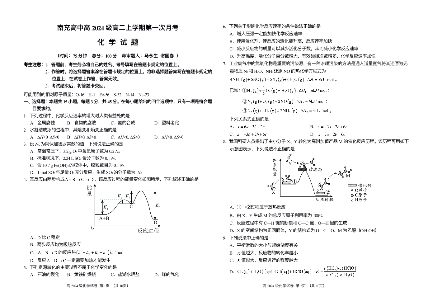 高二化学--四川省南充高级中学2025-2026学年高二上学期10月月考