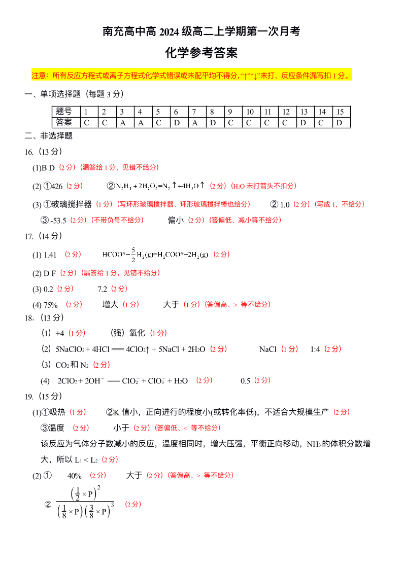 高二化学答案--四川省南充高级中学2025-2026学年高二上学期10月月考