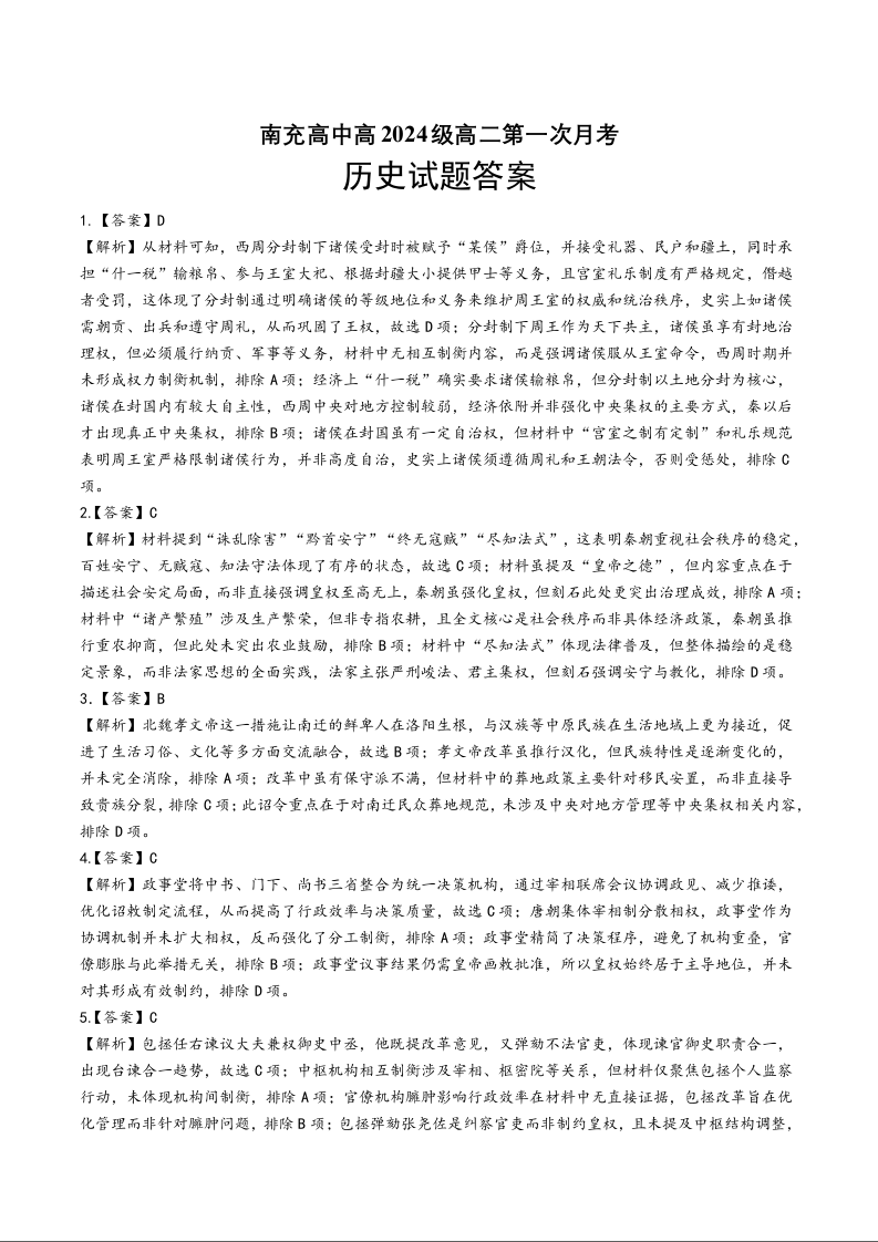 高二历史答案--四川省南充高级中学2025-2026学年高二上学期10月月考