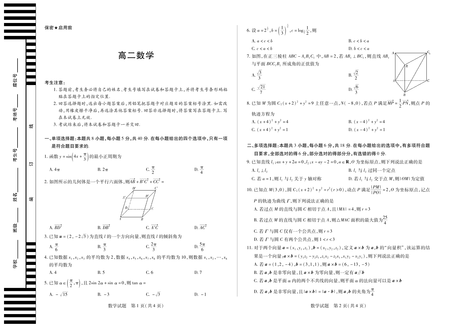高二数学--湖南省天一大联考2025-2026学年高二上学期10月联考