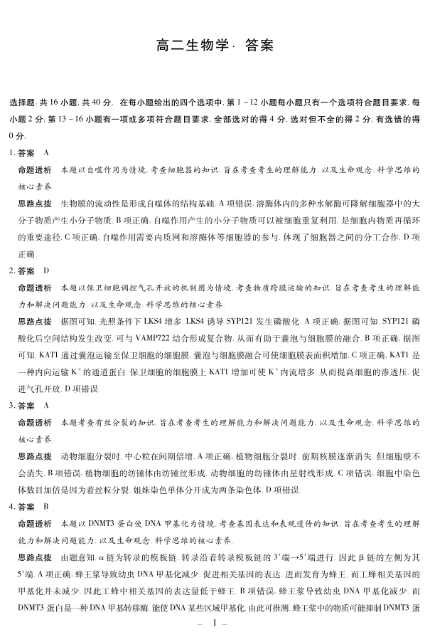 高二生物答案--湖南省天一大联考2025-2026学年高二上学期10月联考