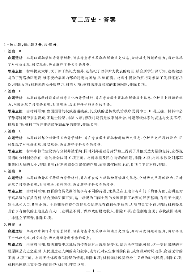 高二历史答案--湖南省天一大联考2025-2026学年高二上学期10月联考