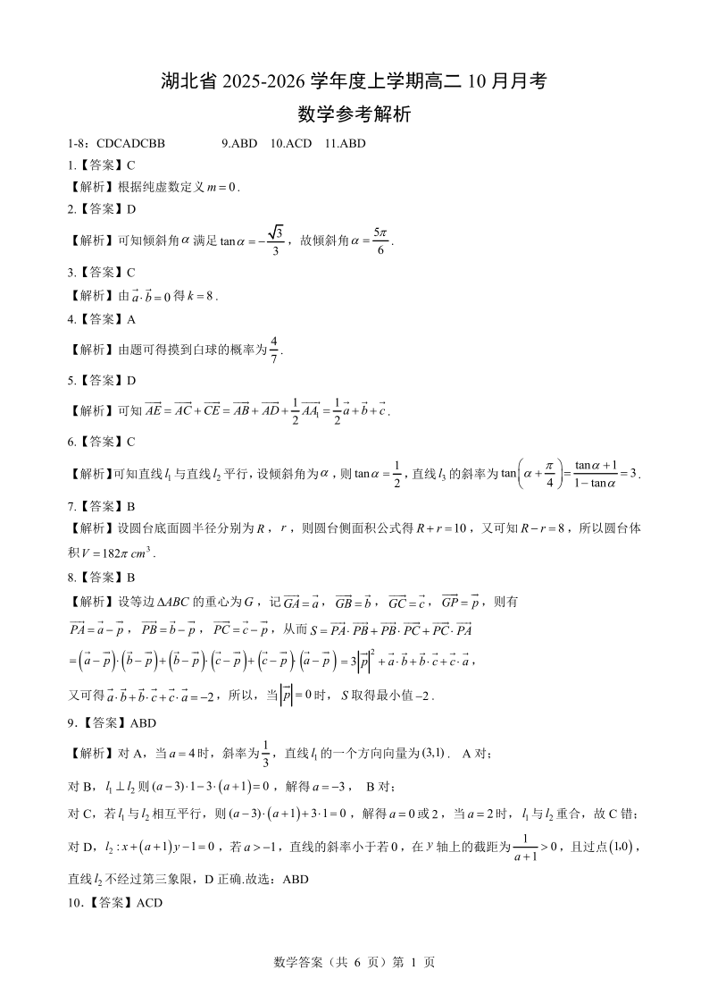 高二数学答案--湖北省新八校联考2025-2026学年度上学期高二10月月考
