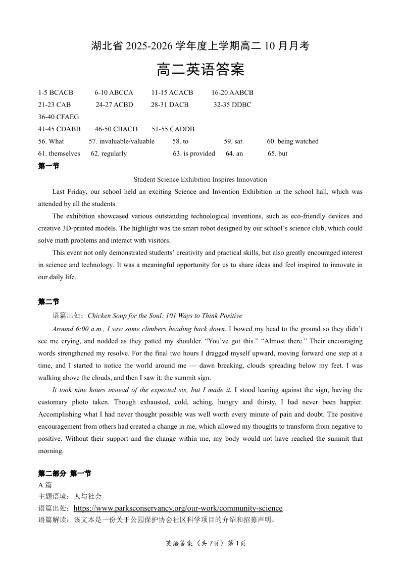 高二英语答案--湖北省新八校联考2025-2026学年度上学期高二10月月考