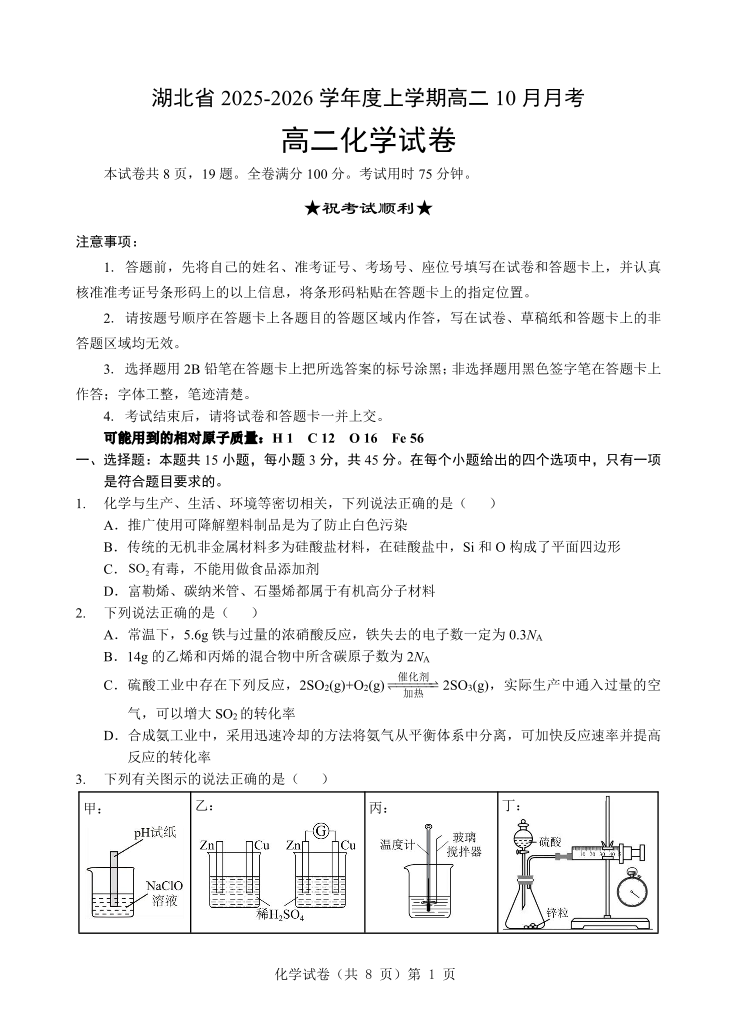 高二化学--湖北省新八校联考2025-2026学年度上学期高二10月月考