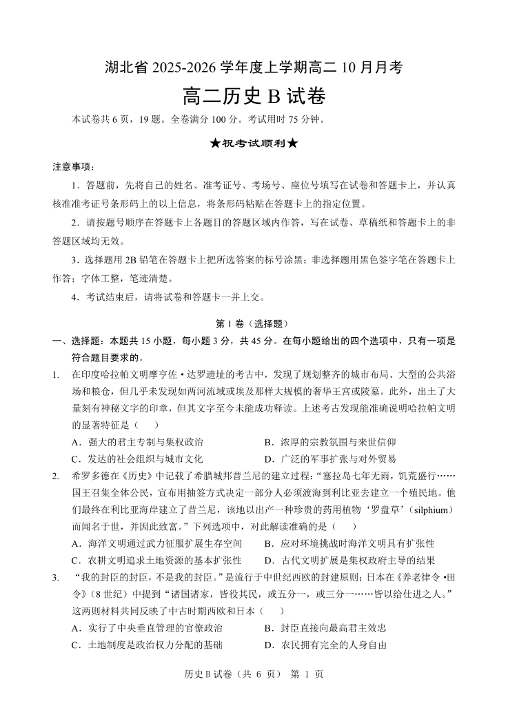 高二历史B--湖北省新八校联考2025-2026学年度上学期高二10月月考