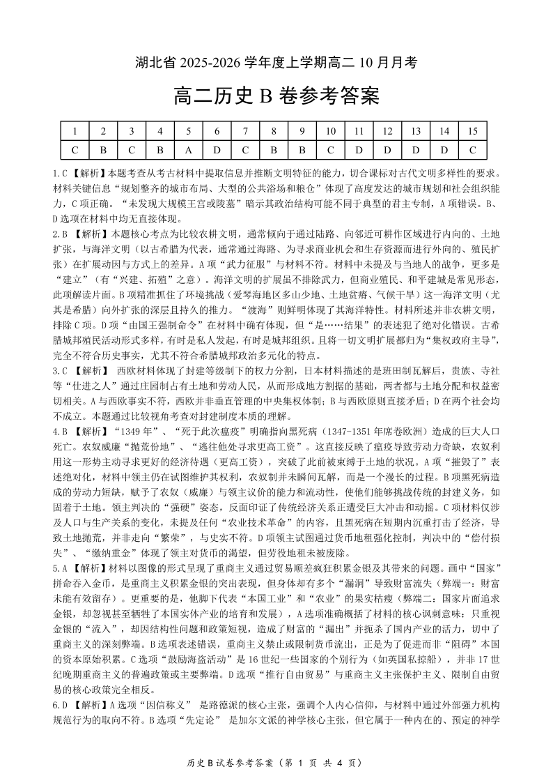 高二历史B答案--湖北省新八校联考2025-2026学年度上学期高二10月月考