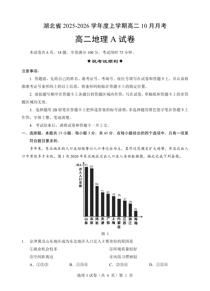 高二地理A--湖北省新八校联考2025-2026学年度上学期高二10月月考