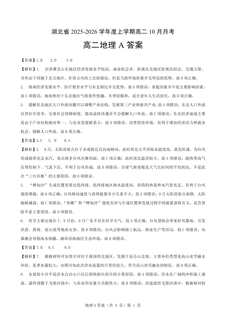 高二地理A答案--湖北省新八校联考2025-2026学年度上学期高二10月月考