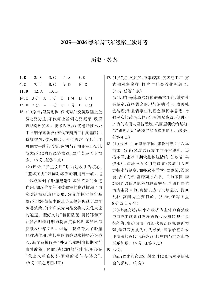 高三历史答案--海南省部分学校2026届高三上学期第二次月考