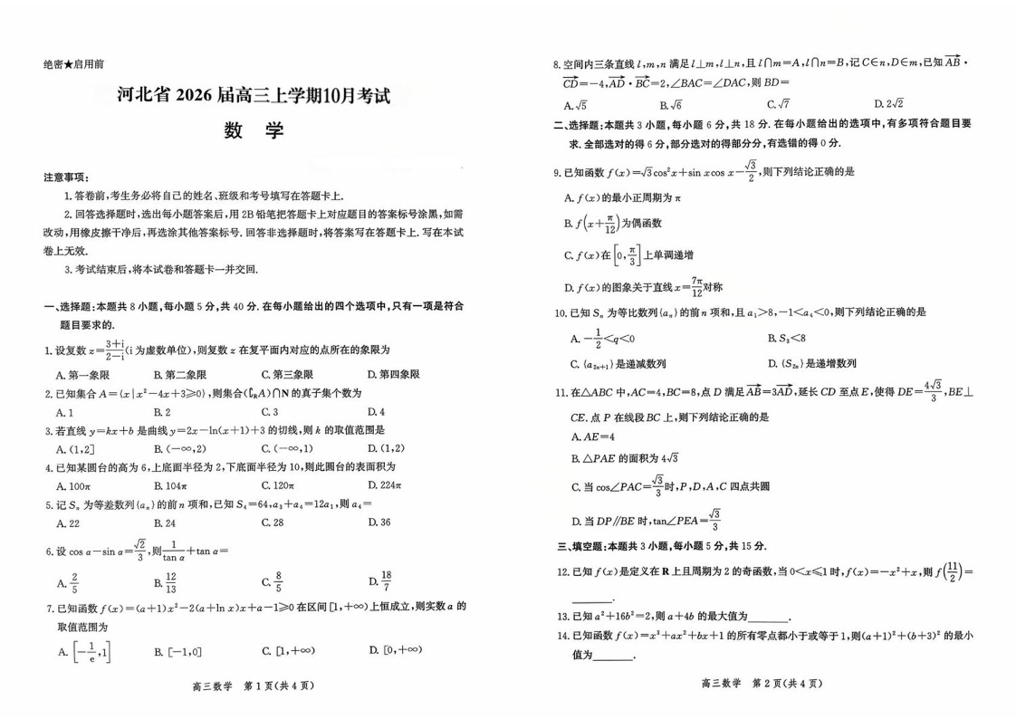 高三数学+答案--河北省示范高中联盟2026届高三上学期10月月考