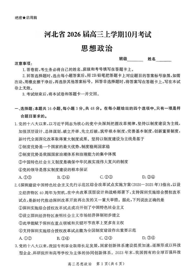 高三政治--河北省示范高中联盟2026届高三上学期10月月考