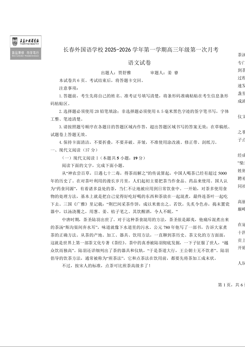 高三语文+答案--吉林省长春外国语学校2026届高三上学期10月月考
