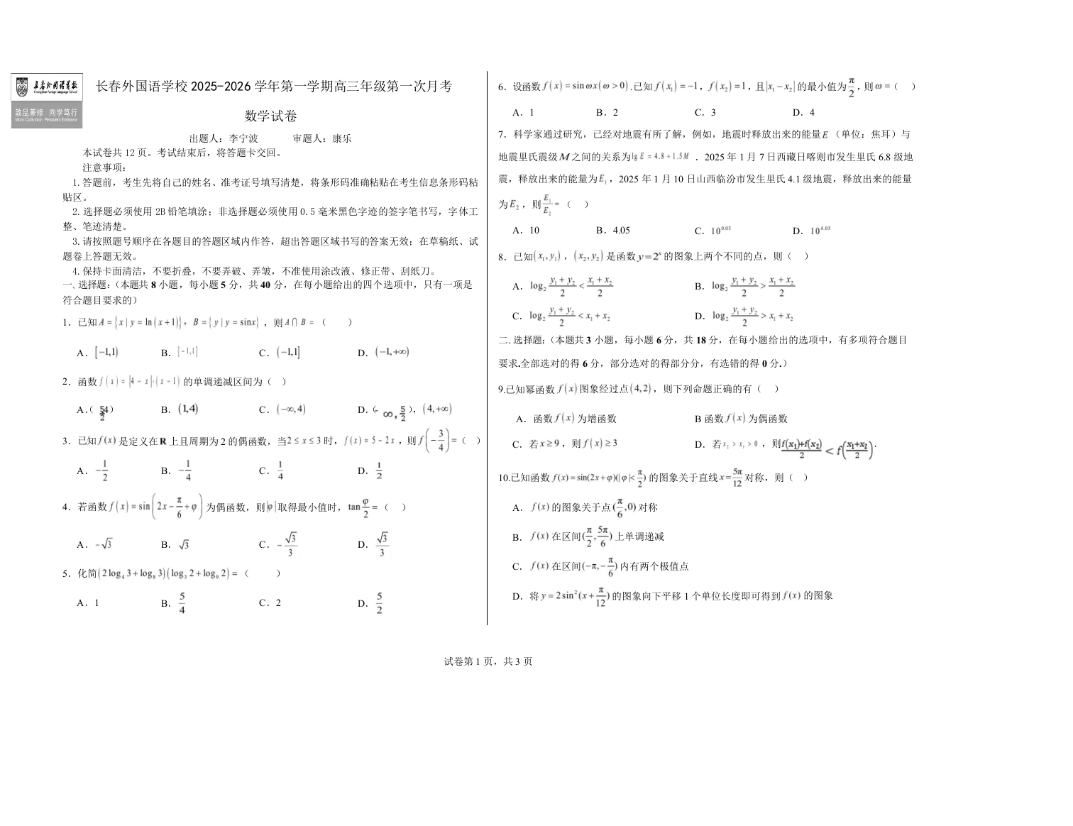 高三数学+答案--吉林省长春外国语学校2026届高三上学期10月月考