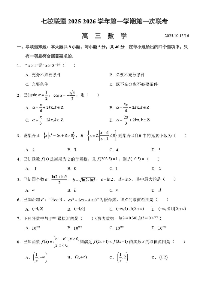 高三数学+答案--江苏省扬州市七校联盟2026届高三上学期第一次联考(10月)