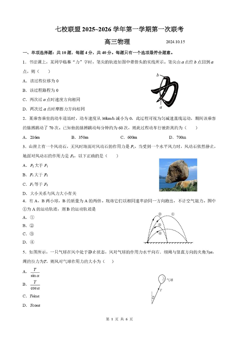 高三物理--江苏省扬州市七校联盟2026届高三上学期第一次联考(10月)