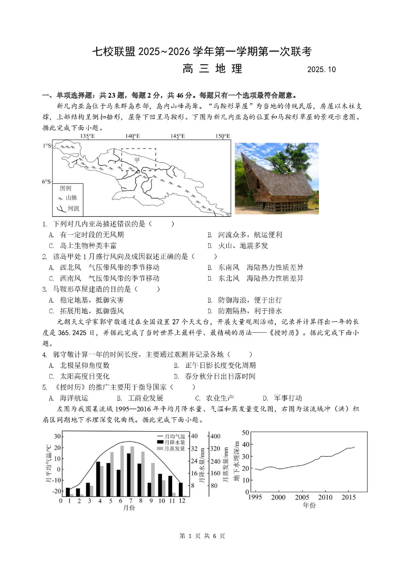 高三地理+答案--江苏省扬州市七校联盟2026届高三上学期第一次联考(10月)