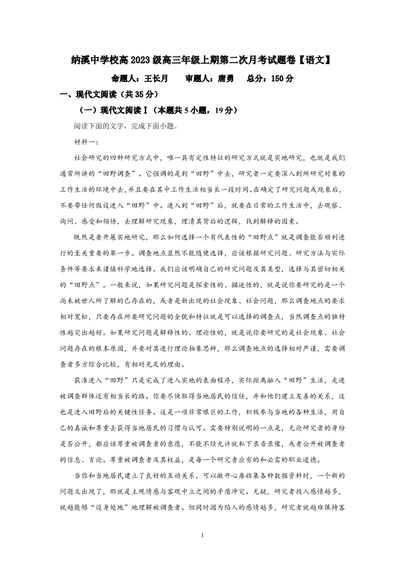 高三语文+答案--四川省泸州市纳溪中学校高2023级高三年级上期第二次月考