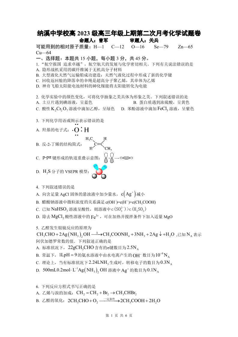 高三化学+答案--四川省泸州市纳溪中学校高2023级高三年级上期第二次月考