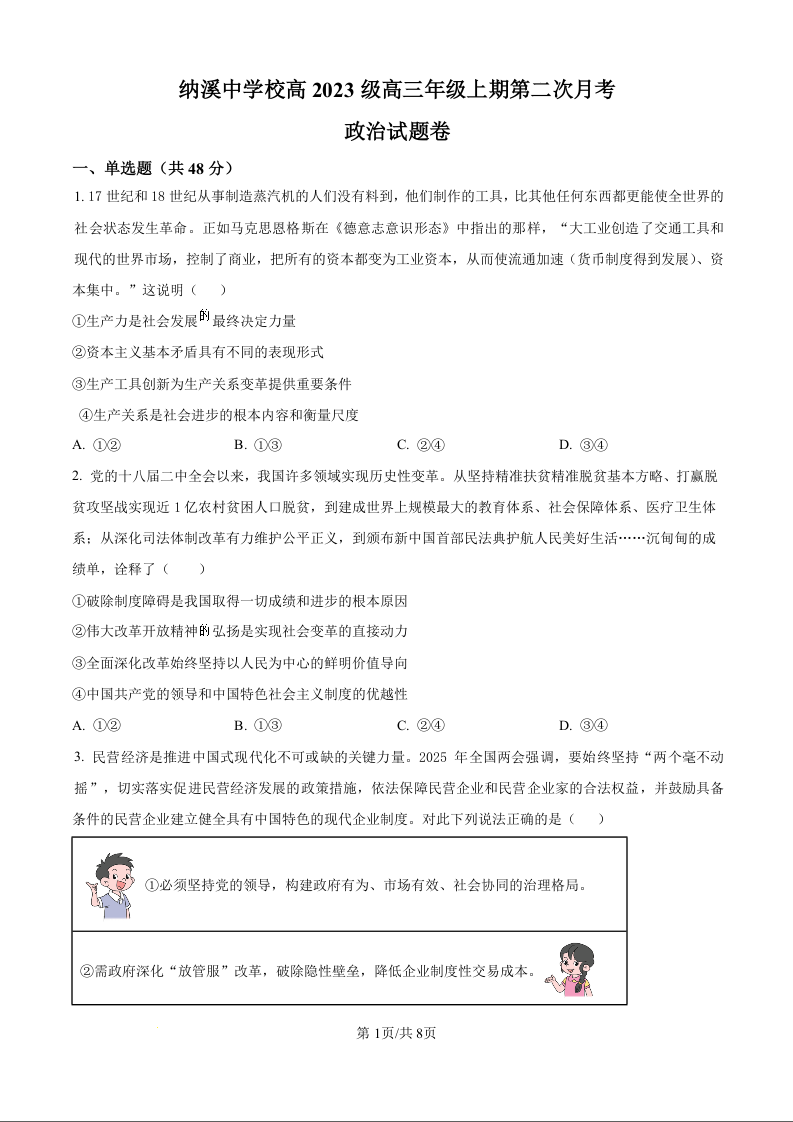 高三政治--四川省泸州市纳溪中学校高2023级高三年级上期第二次月考