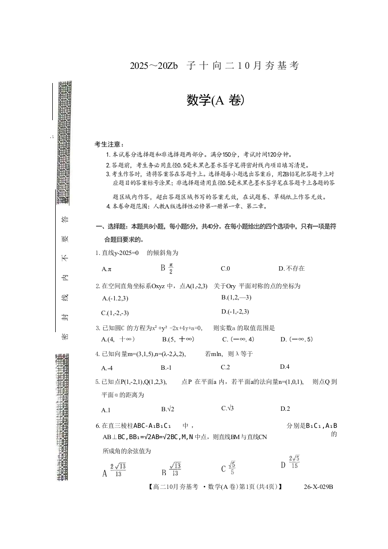 高二数学--山西省三晋卓越联盟2025-2026学年高二10月夯基考